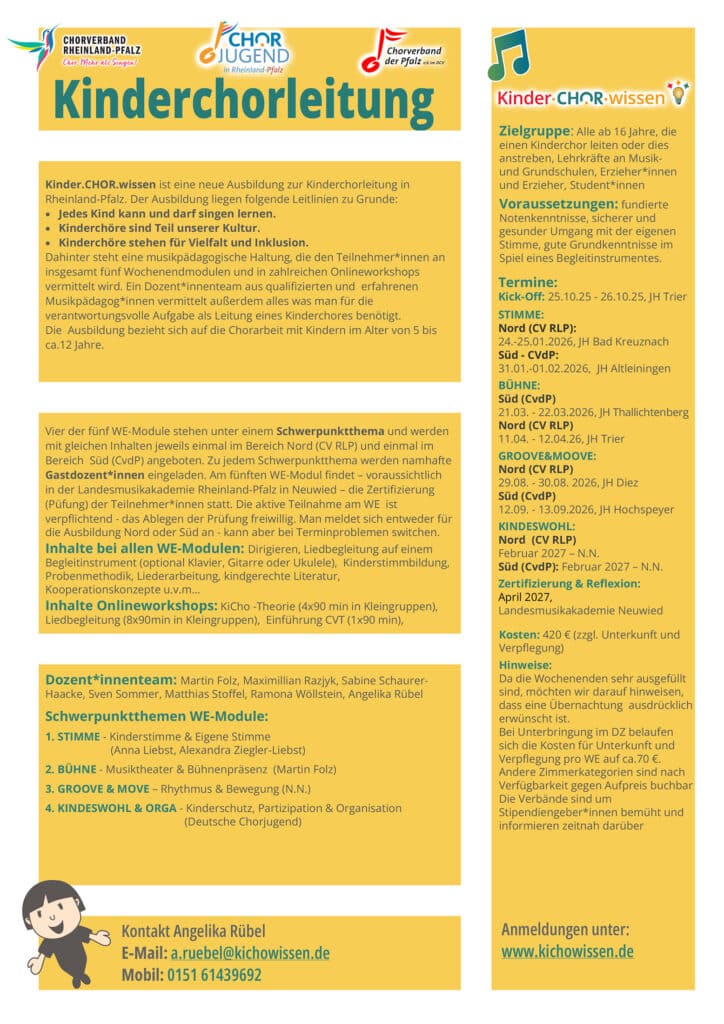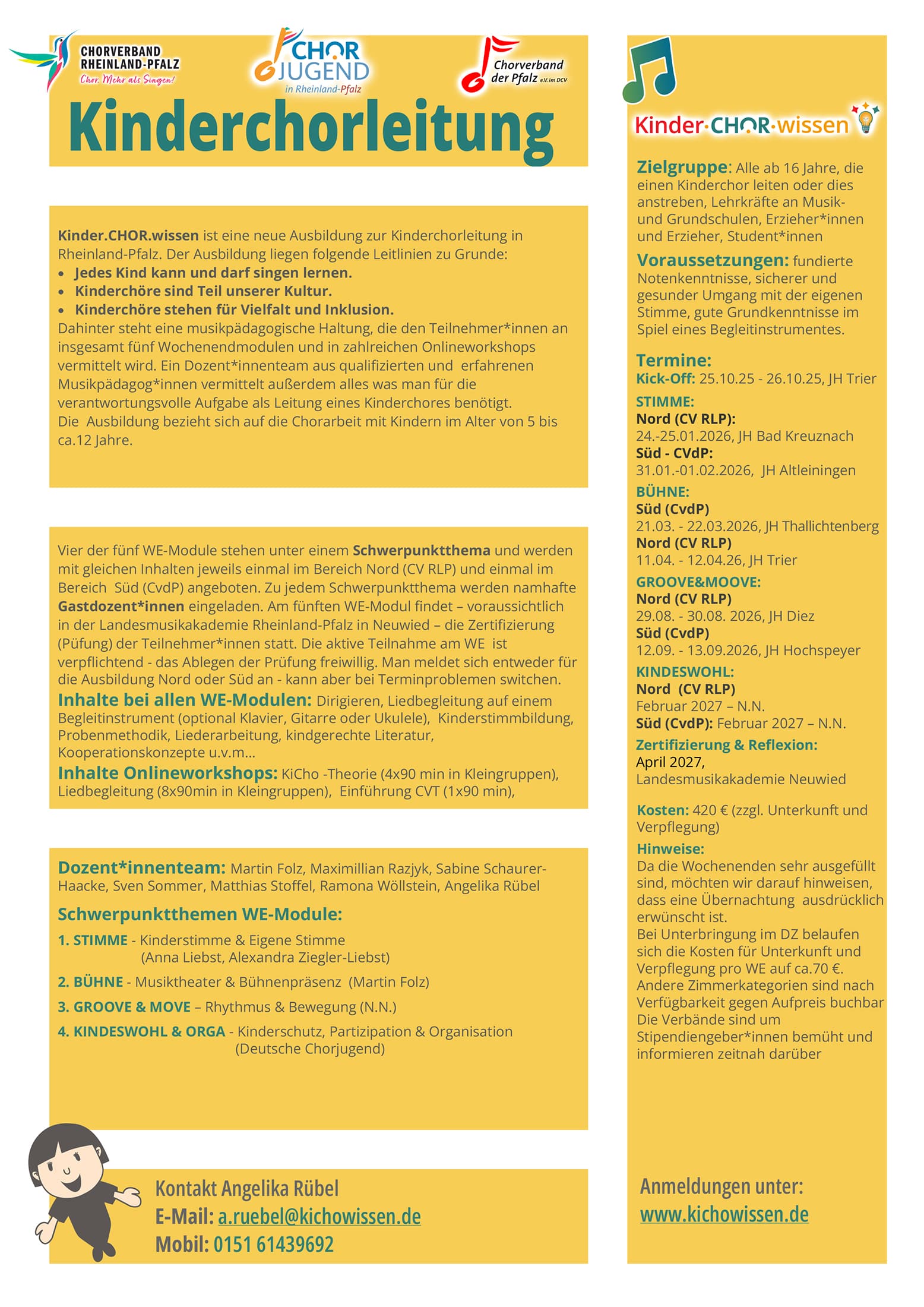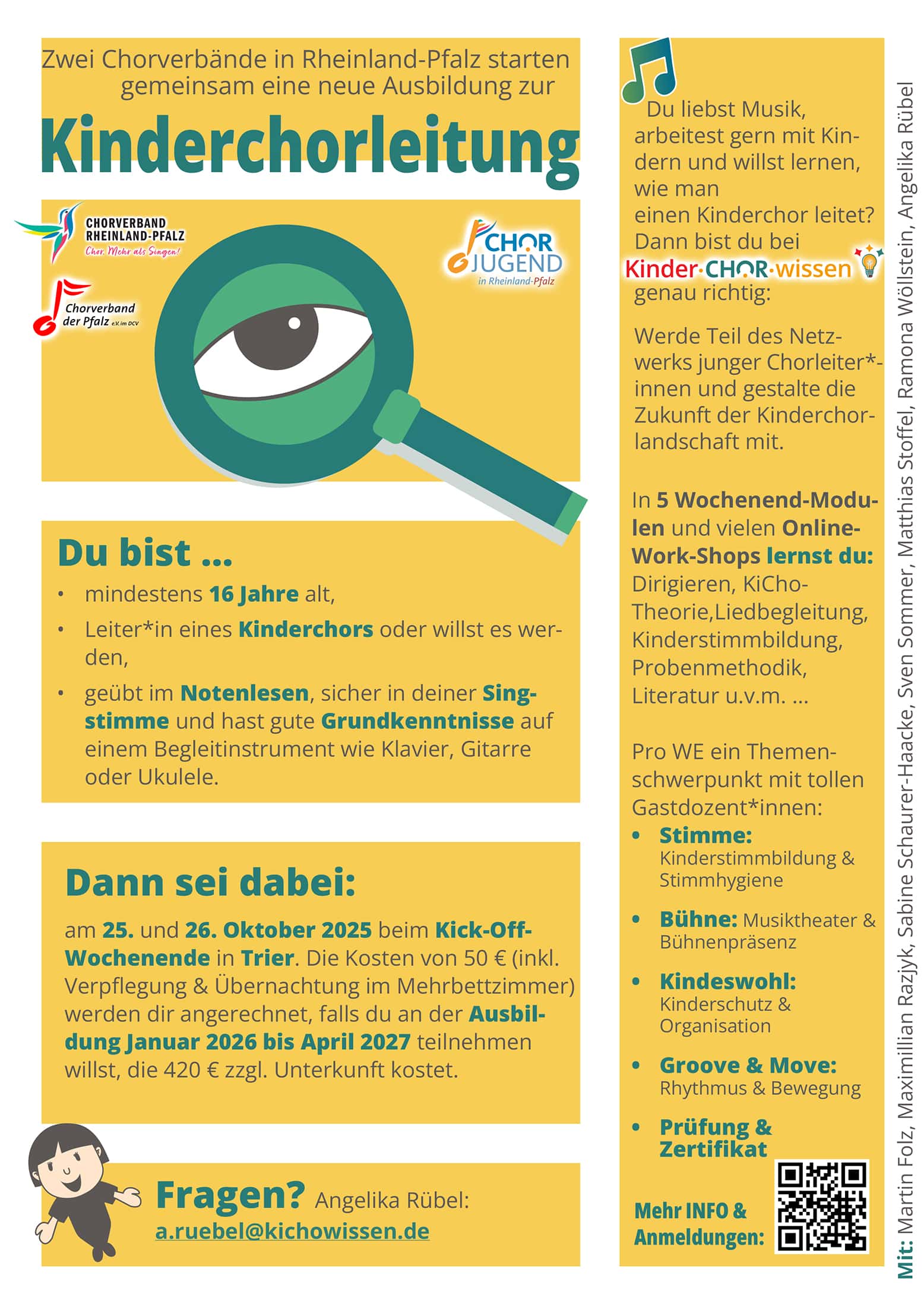 Diese Ausbildung ist eine Kooperation des Chorverbands Rheinland-Pfalz und des Chorverbands der Pfalz – entstanden als Antwort auf den großen Bedarf an qualifizierten Kinderchor-Leitenden.